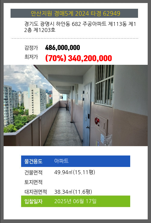 | 건물면적 | 49.94㎡ (15.11평) | 채무자 | 김** | 최저가 | (70%) 340,200,000 |
