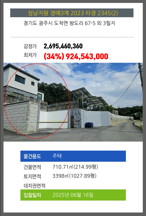 | 용도 | 주택 | 채권자 | 삼** | 감정가 | 2,695,460,360 |