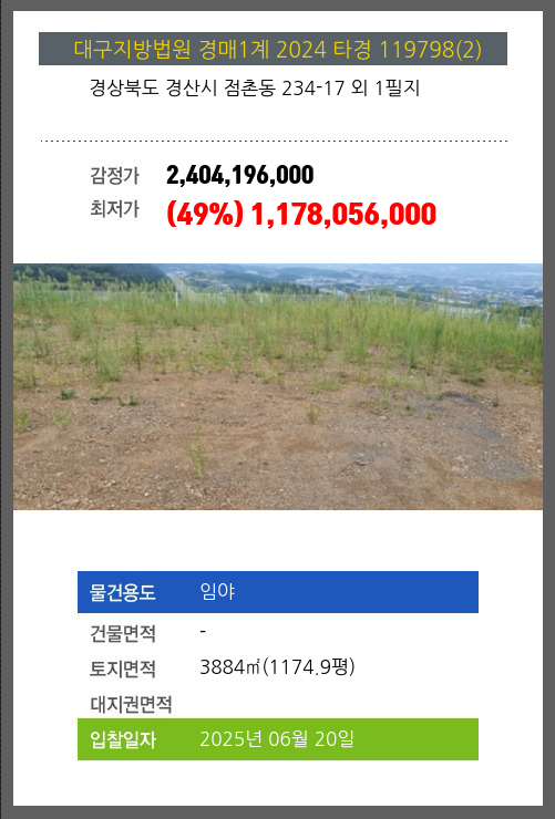 | 용도 | 임야 | 채권자 | 금** | 감정가 | 2,404,196,000 |