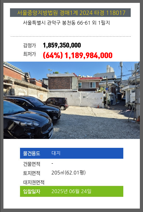 | 토지면적 | 205㎡ (62.01평) | 소유자 | 서** | 보증금 | (10%) 118,998,400 |