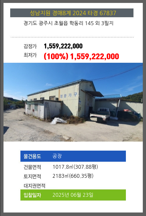| 용도 | 공장 | 채권자 | 고** | 감정가 | 1,559,222,000 |