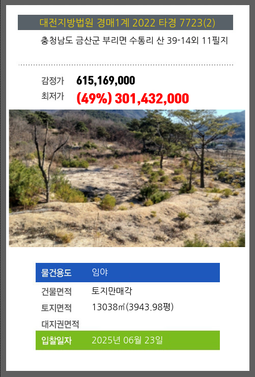 | 용도 | 임야 | 채권자 | 정**외1명 | 감정가 | 615,169,000 |