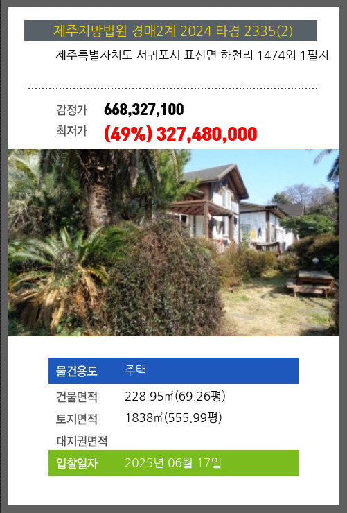 | 건물면적 | 228.95㎡ (69.26평) | 채무자 | 맹** | 최저가 | (49%) 327,480,000 |