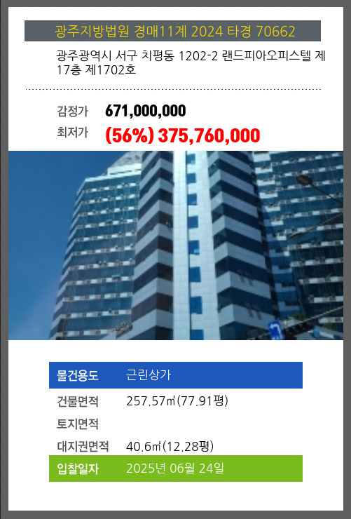 본건은 광주광역시 서구 치평동 1202-2 랜드피아오피스텔 제17층 제1702호