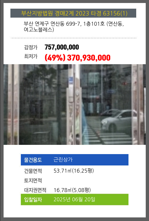 본건은 부산 연제구 연산동 699-7, 1층101호 (연산동,여고노블레스)