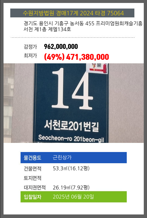 용인상가경매 용인시 기흥구 농서동 455 프리미엄원희캐슬기흥서천 제1층 제엘134호 №2024 타경 75064