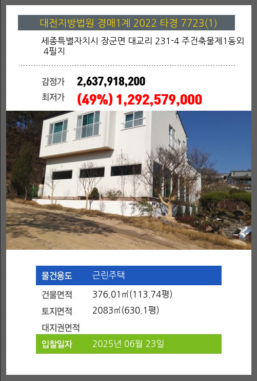 | 소재지 | [지번] 세종특별자치시 장군면 대교리 231-4 주건축물제1동외 4필지 [도로명 주소] 세종특별자치시 장군면 대교절골길 35 주건축물제1동 |