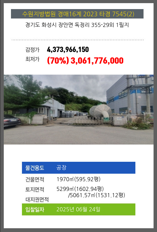 | 용도 | 공장 | 채권자 | ㈜**외1명 | 감정가 | 4,373,966,150 |