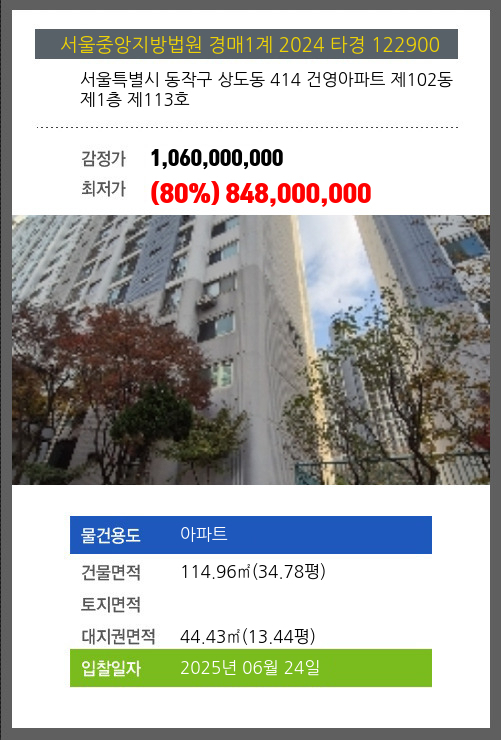 | 건물면적 | 114.96㎡ (34.78평) | 채무자 | 김**외1명 | 최저가 | (80%) 848,000,000 |