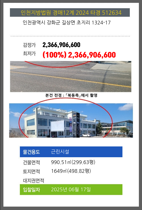 | 용도 | 근린시설 | 채권자 | 북** | 감정가 | 2,366,906,600 |