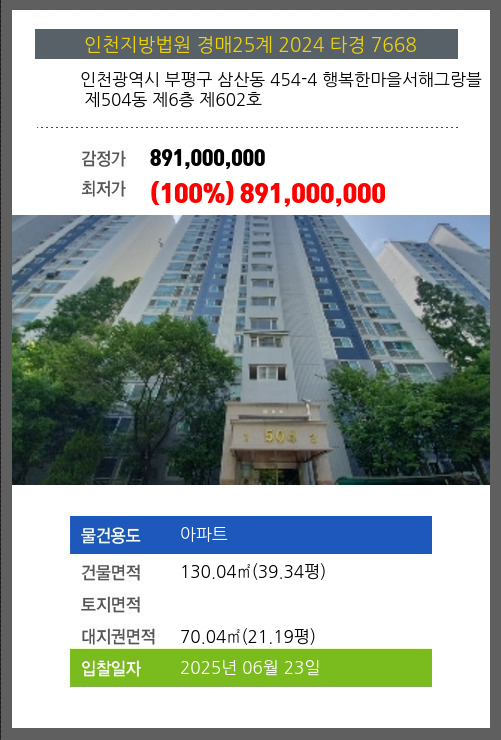 부평아파트경매 부평구 삼산동 454-4 행복한마을서해그랑블 제504동 제6층 제602호 №2024 타경 7668