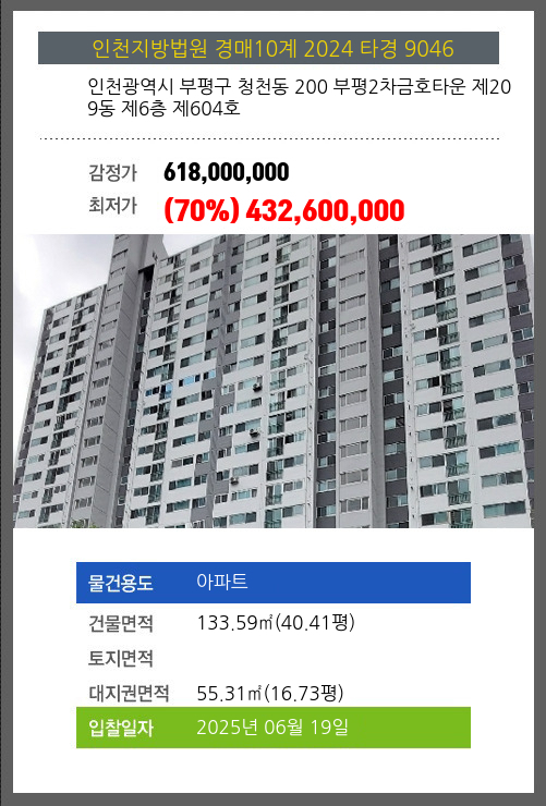 부평아파트경매 부평구 청천동 200 부평2차금호타운 제209동 제6층 제604호 №2024 타경 9046
