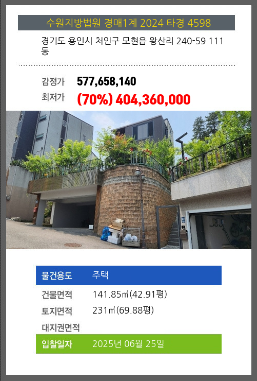 용인주택경매 용인시 처인구 모현읍 왕산리 240-59 111동 №2024 타경 4598