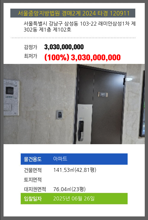 | 대지권 | 76.04㎡ (23평) | 소유자 | 방**외1명 | 보증금 | (10%) 303,000,000 |