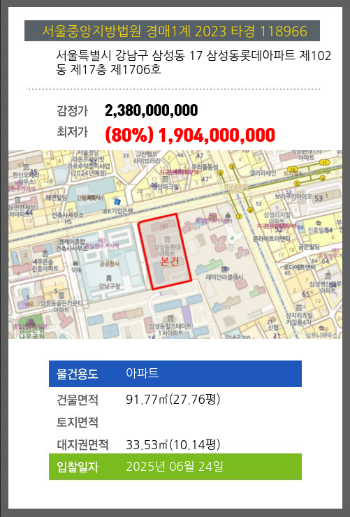 강남아파트경매 강남구 삼성동 17 삼성동롯데아파트 제102동 제17층 제1706호 №2023 타경 118966