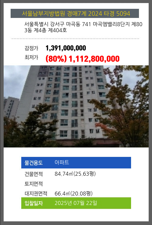 강서아파트경매 강서구 마곡동 741 마곡엠밸리8단지 제803동 제4층 제404호 №2024 타경 5094