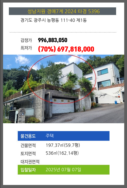 | 건물면적 | 197.37㎡ (59.7평) | 채무자 | 복**외1명 | 최저가 | (70%) 697,818,000 |