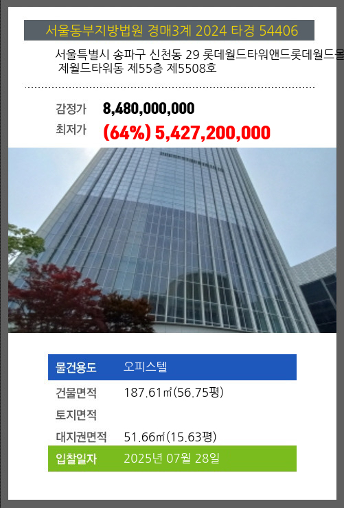 본건은 서울특별시 송파구 신천동 29 롯데월드타워앤드롯데월드몰 제월드타워동 제55층 제5508호