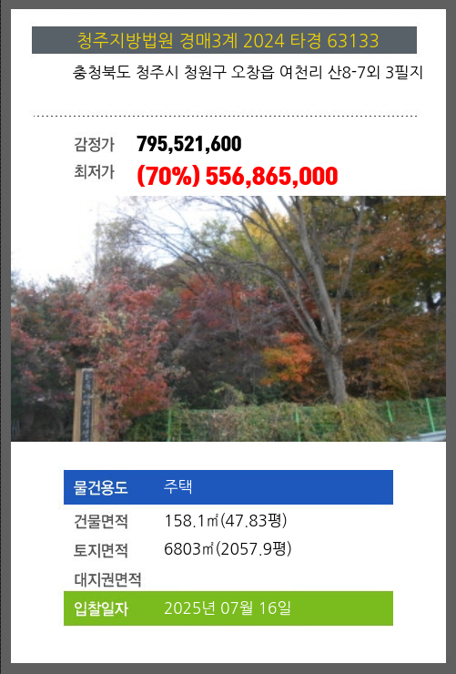 | 토지면적 | 6803㎡ (2057.9평) | 소유자 | 고**외3명 | 보증금 | (10%) 55,686,500 |