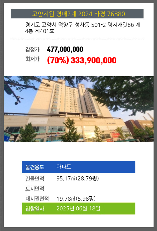| 소재지 | [지번] 경기도 고양시 덕양구 성사동 501-2 명지캐럿86 제4층 제401호 [도로명 주소] 경기도 고양시 덕양구 ( 대지권의 목적인 지 번 지 목 명지캐럿86 제4층 제401호 |