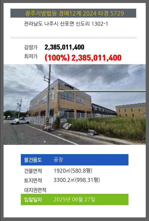 | 토지면적 | 3300.2㎡ (998.31평) | 소유자 | ㈜** | 보증금 | (10%) 238,501,140 |