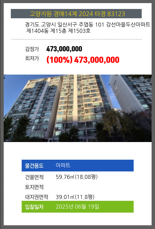 고양아파트경매 고양시 일산서구 주엽동 101 강선마을두산아파트 제1404동 제15층 제1503호 №2024 타경 83123