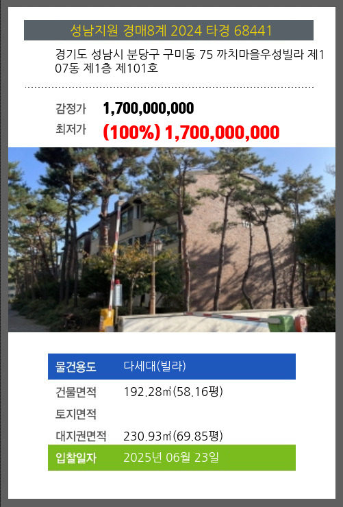 성남빌라경매 성남시 분당구 구미동 75 까치마을우성빌라 제107동 제1층 제101호 №2024 타경 68441