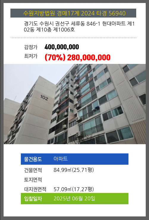 본건은 경기도 수원시 권선구 세류동 846-1 현대아파트 제102동 제10층 제1006호