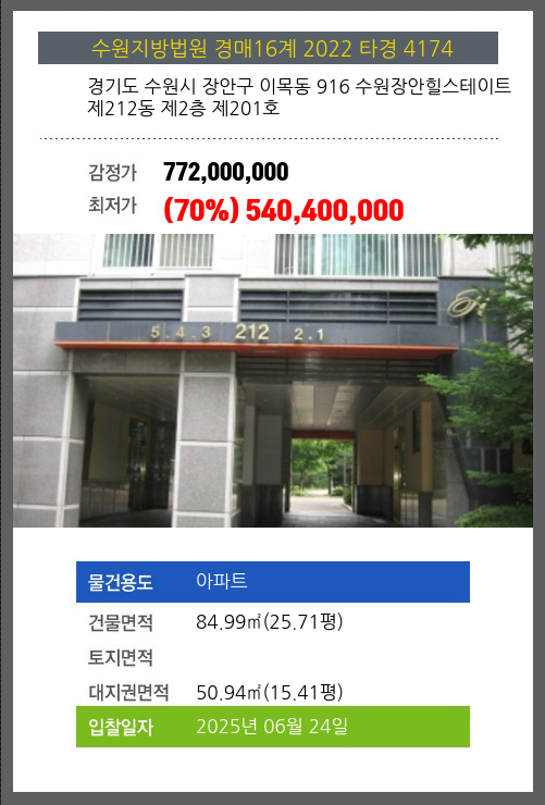 본건은 경기도 수원시 장안구 이목동 916 수원장안힐스테이트 제212동 제2층 제201호
