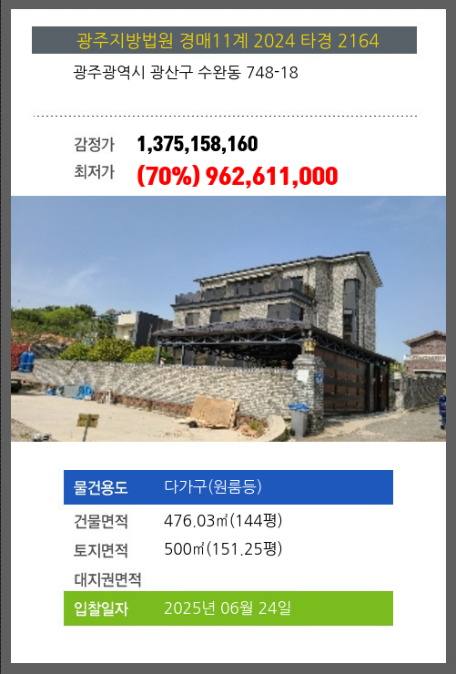 | 용도 | 다가구(원룸등) | 채권자 | 비**외1명 | 감정가 | 1,375,158,160 |