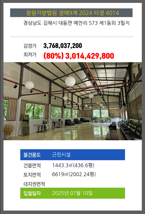 | 건물면적 | 1443.3㎡ (436.6평) | 채무자 | 염** | 최저가 | (80%) 3,014,429,800 |