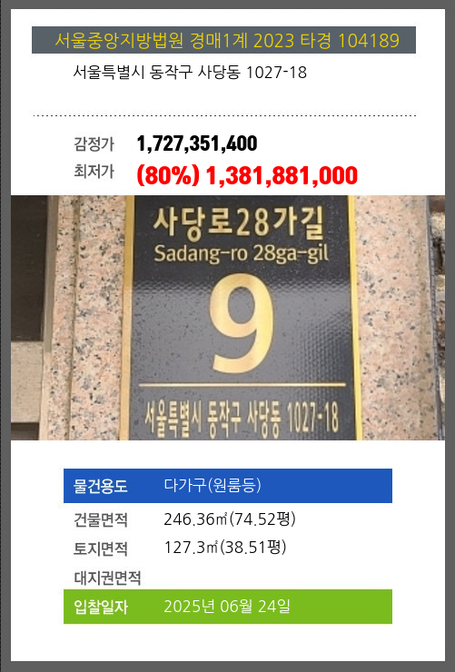 | 건물면적 | 246.36㎡ (74.52평) | 채무자 | 최** | 최저가 | (80%) 1,381,881,000 |