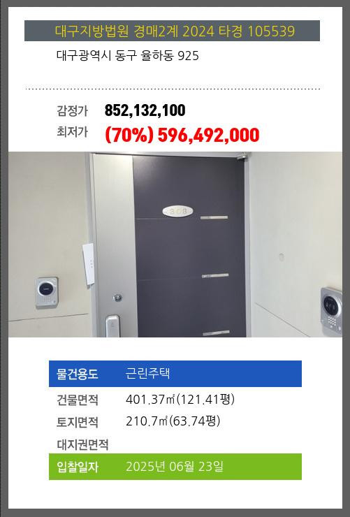 | 용도 | 근린주택 | 채권자 | 달** | 감정가 | 852,132,100 |