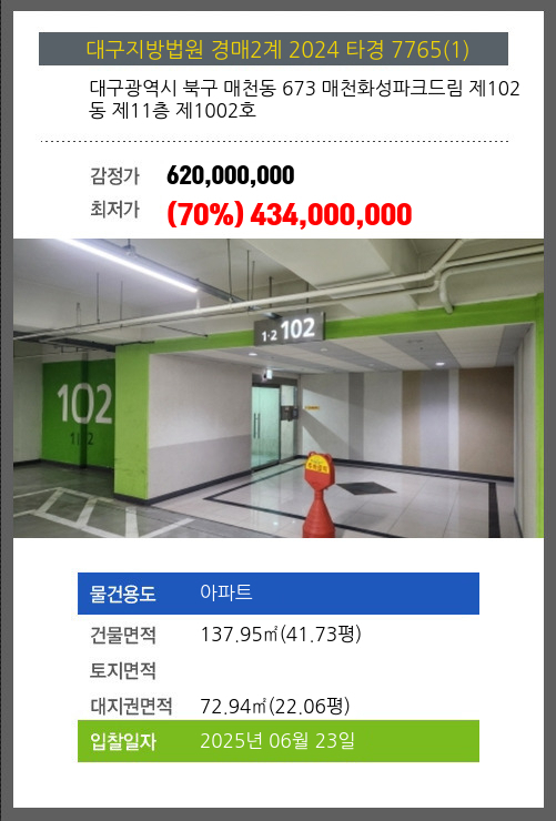 본건은 대구광역시 북구 매천동 673 매천화성파크드림 제102동 제11층 제1002호