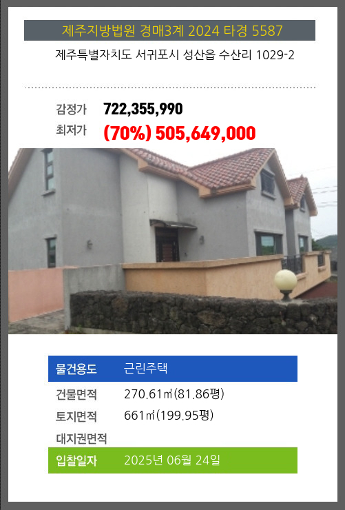 | 건물면적 | 270.61㎡ (81.86평) | 채무자 | 일** | 최저가 | (70%) 505,649,000 |