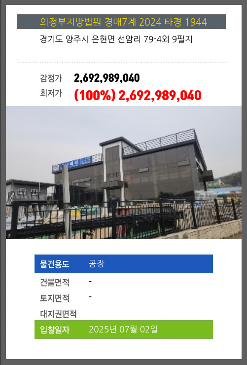 | 용도 | 공장 | 채권자 | 농** | 감정가 | 2,692,989,040 |