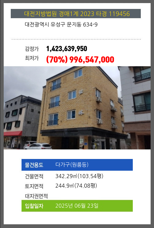 | 용도 | 다가구(원룸등) | 채권자 | 유** | 감정가 | 1,423,639,950 |