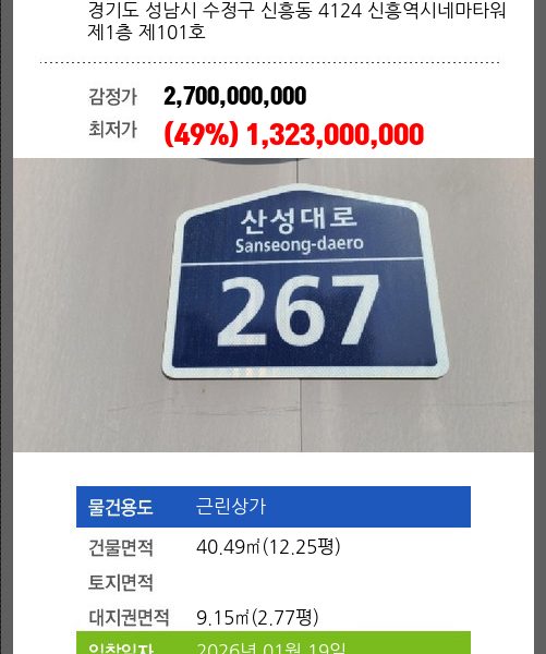 | 용도 | 근린상가 | 채권자 | 유** | 감정가 | 1,533,000,000 |