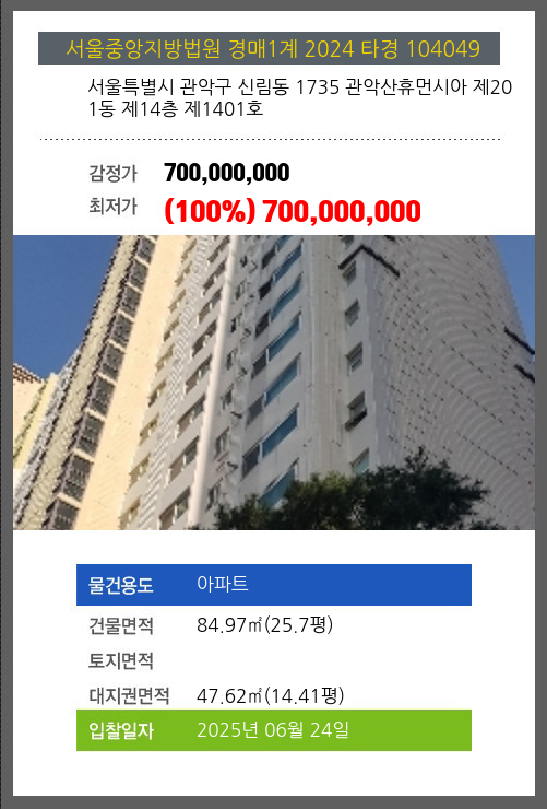관악아파트경매 관악구 신림동 1735 관악산휴먼시아 제201동 제14층 제1401호 №2024 타경 104049