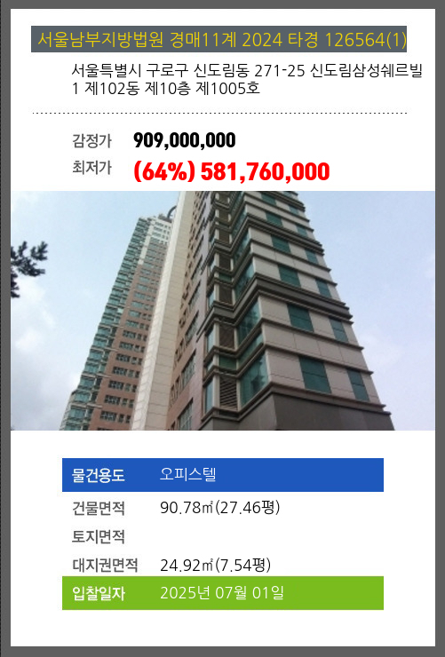구로오피스텔경매 구로구 신도림동 271-25 신도림삼성쉐르빌1 제102동 제10층 제1005호 №2024 타경 126564(1)