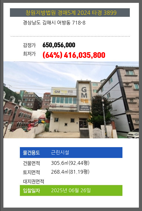 | 건물면적 | 305.6㎡ (92.44평) | 채무자 | 배** | 최저가 | (64%) 416,035,800 |