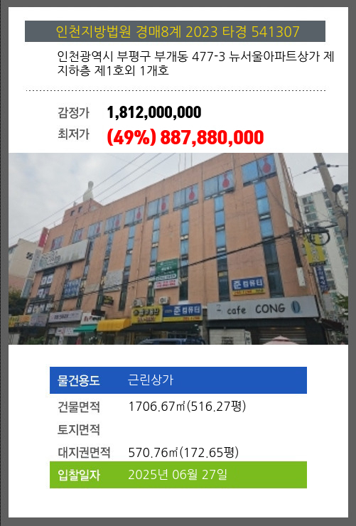 본건은 인천광역시 부평구 부개동 477-3 뉴서울아파트상가 제지하층 제1호외 1개호