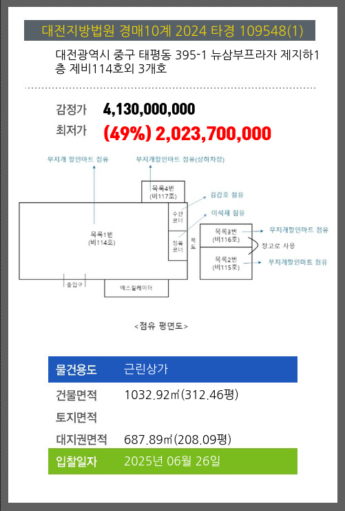 중상가경매 중구 태평동 395-1 뉴삼부프라자 제지하1층 제비114호외 3개호 №2024 타경 109548(1)