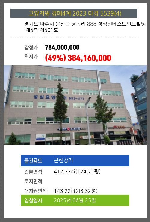 본건은 경기도 파주시 문산읍 당동리 888 성심인베스트먼트빌딩 제5층 제501호