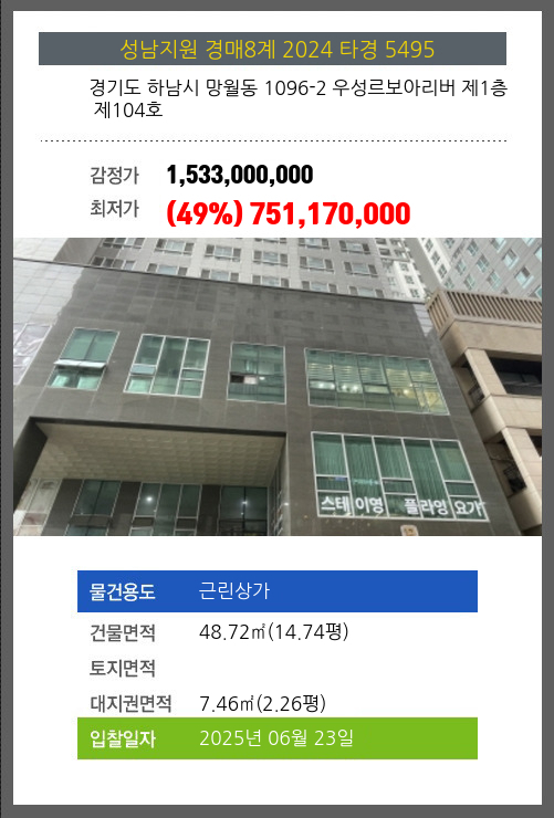 | 용도 | 근린상가 | 채권자 | 유** | 감정가 | 1,533,000,000 |