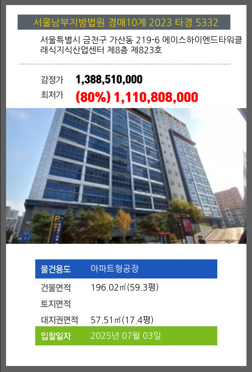 본건은 서울특별시 금천구 가산동 219-6 에이스하이엔드타워클래식지식산업센터 제8층 제823호