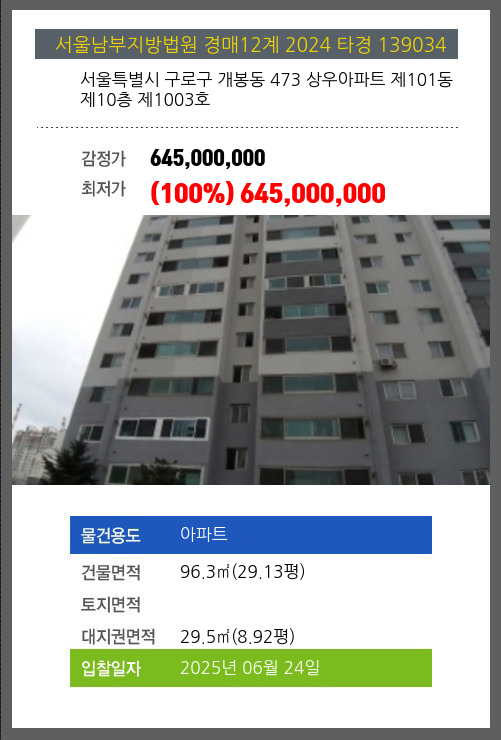 구로아파트경매 구로구 개봉동 473 상우아파트 제101동 제10층 제1003호 №2024 타경 139034