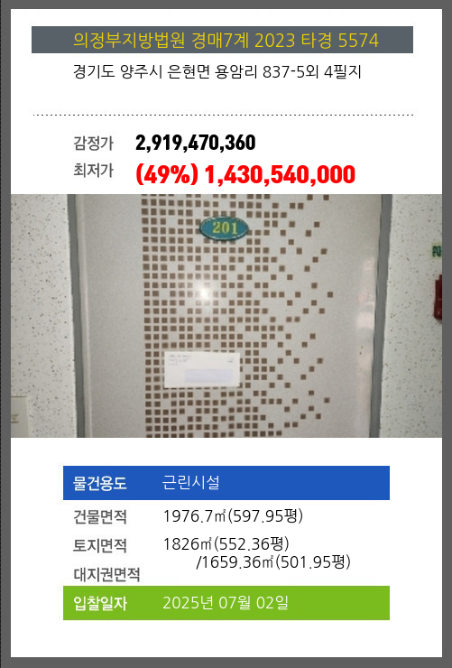 건물면적 1976.7㎡ (597.95평) 채무자 정** 최저가 (49%) 1,430,540,000