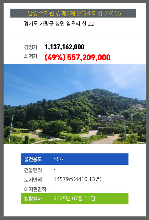 | 용도 | 임야 | 채권자 | 김** | 감정가 | 1,137,162,000 |
