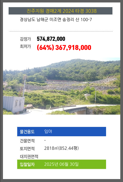 | 용도 | 임야 | 채권자 | 사** | 감정가 | 574,872,000 |